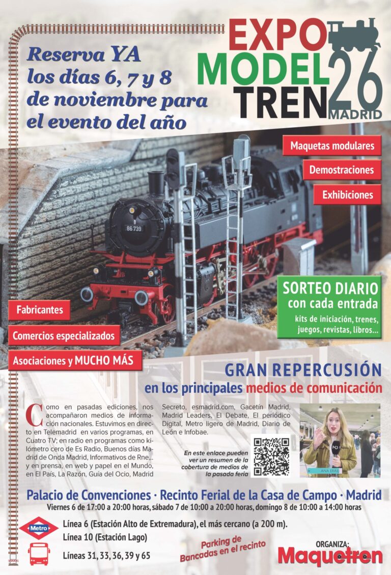 La gran feria del modelismo ferroviario, Expomodeltren, celebrará su edición de 2026 durante los días 6, 7 y 8 de noviembre en el Pabellón de Convenciones de la Casa de Campo (Madrid), en el que se darán cita expositores, comercios, modelistas, aficionados y público en general.